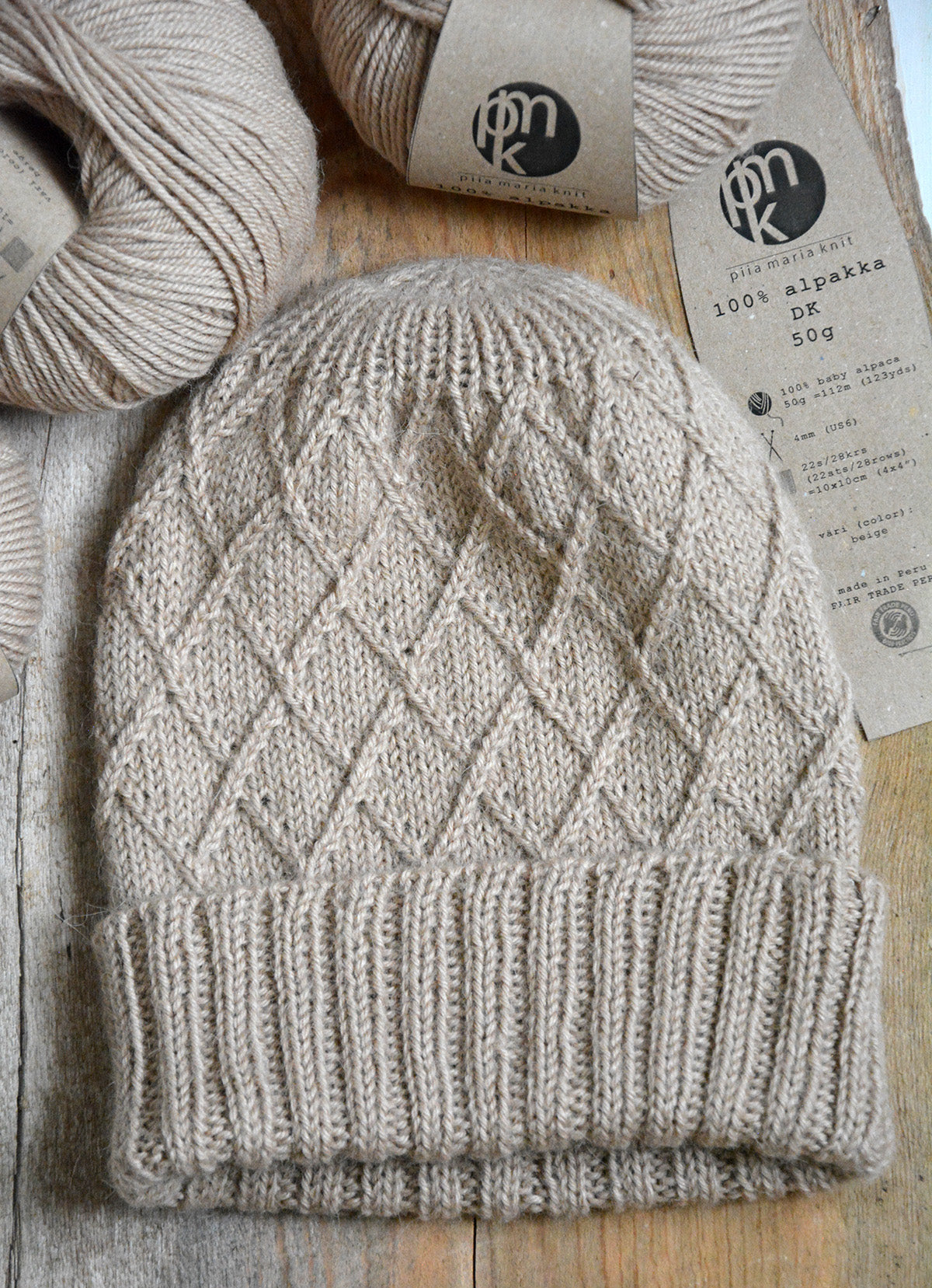 Tarvitset pipoa varten kaksi kerää pehmeää PMK 100% alpakka DK -lankaa. Korvaaviksi langoiksi soveltuvat kaikki DK-vahvuiset alpakka- ja villalangat. Vaaleanpunainen mallikappale on neulottu Novita Wonder Woolista. Tällä langalla piposta tulee napakka. Viimeisen kuvan version on neulottu PMK alpakkalangalla. Tämä pipo on ihanan pehmeä ja se muovautuu päähän luontevasti.