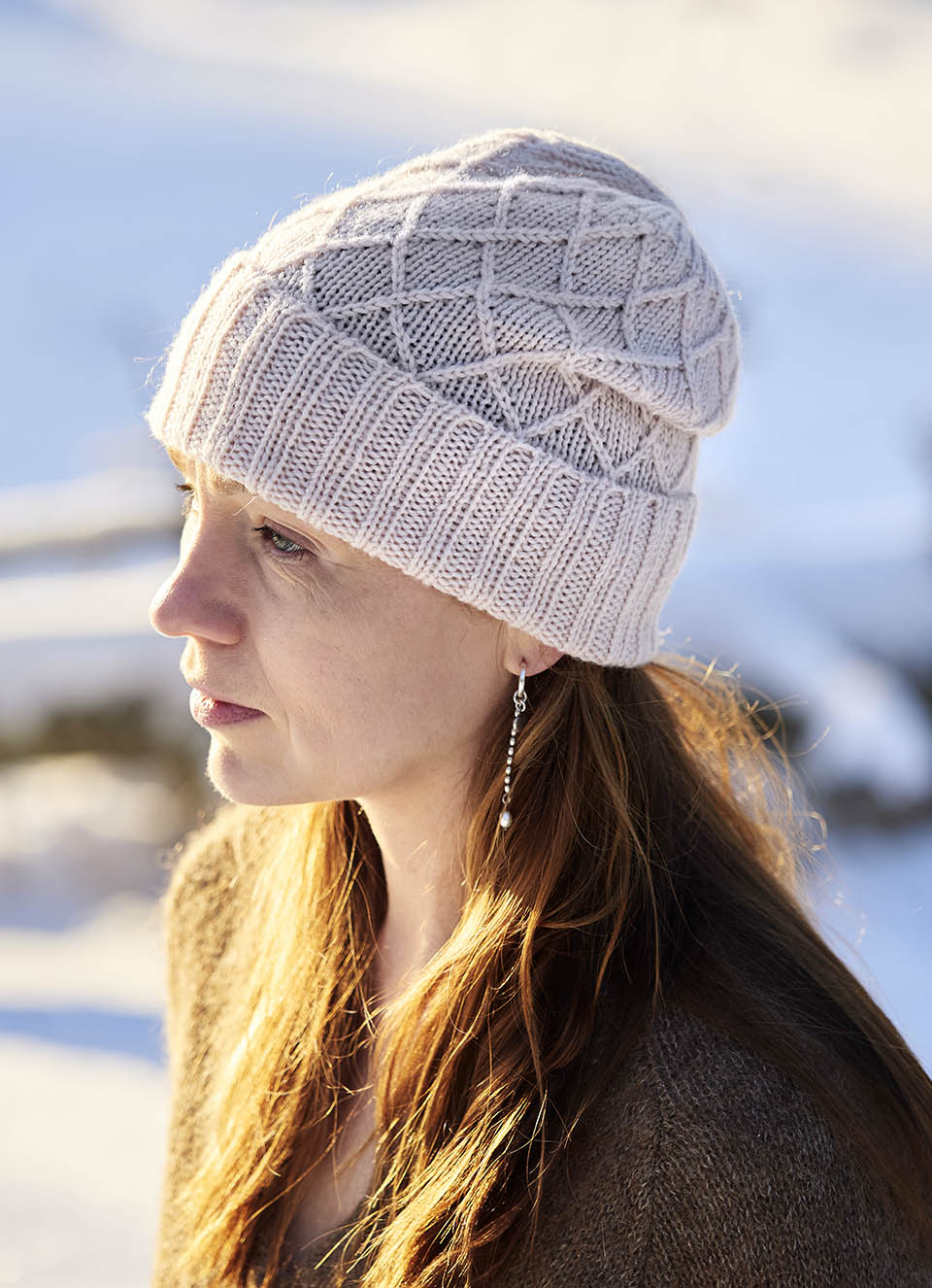 Pipo on korkeanmallinen. Sitä voi pitää päälaen osa taakse taitettuna tai suorana ylöspäin. Jos haluat pipon syvemmälle päähän, taita reunan joustin kolminkertaiseksi tai neulo ristikkoneuletta 8 kerrosta, eli puolikkaan ruudun verran vähemmän.