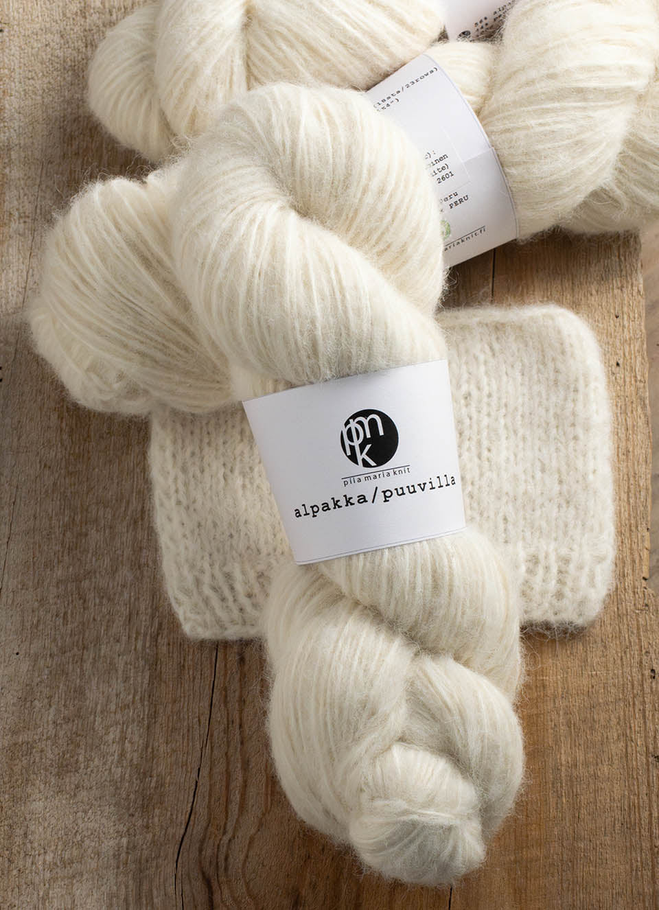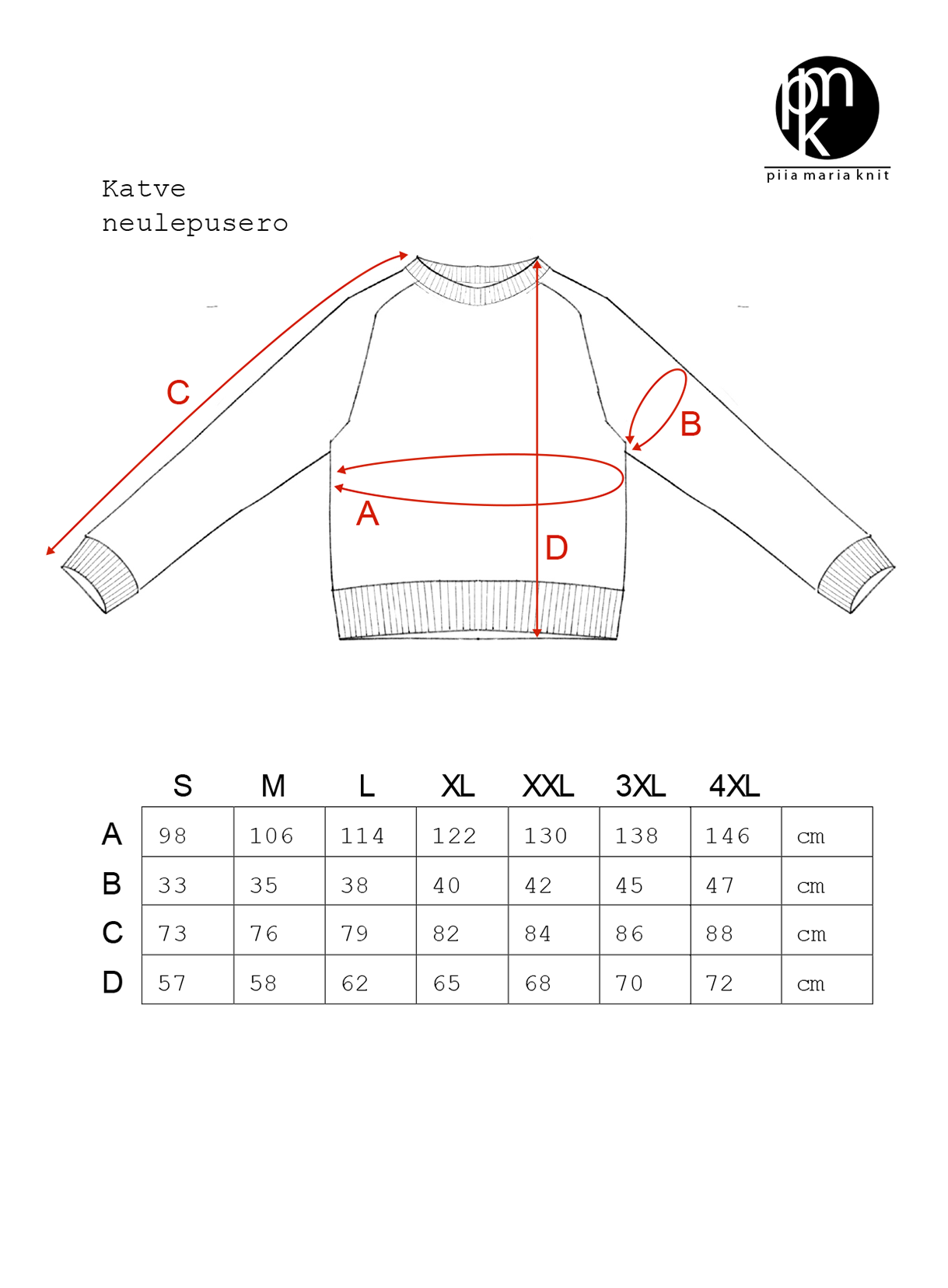 Katve neulotaan pörröisestä PMK alpakka/puuvillasta. Valitse neljästä väristä mieluisin ja tarkista mittataulukosta oikea koko. Suositeltu väljyysvara on 10-20 cm.