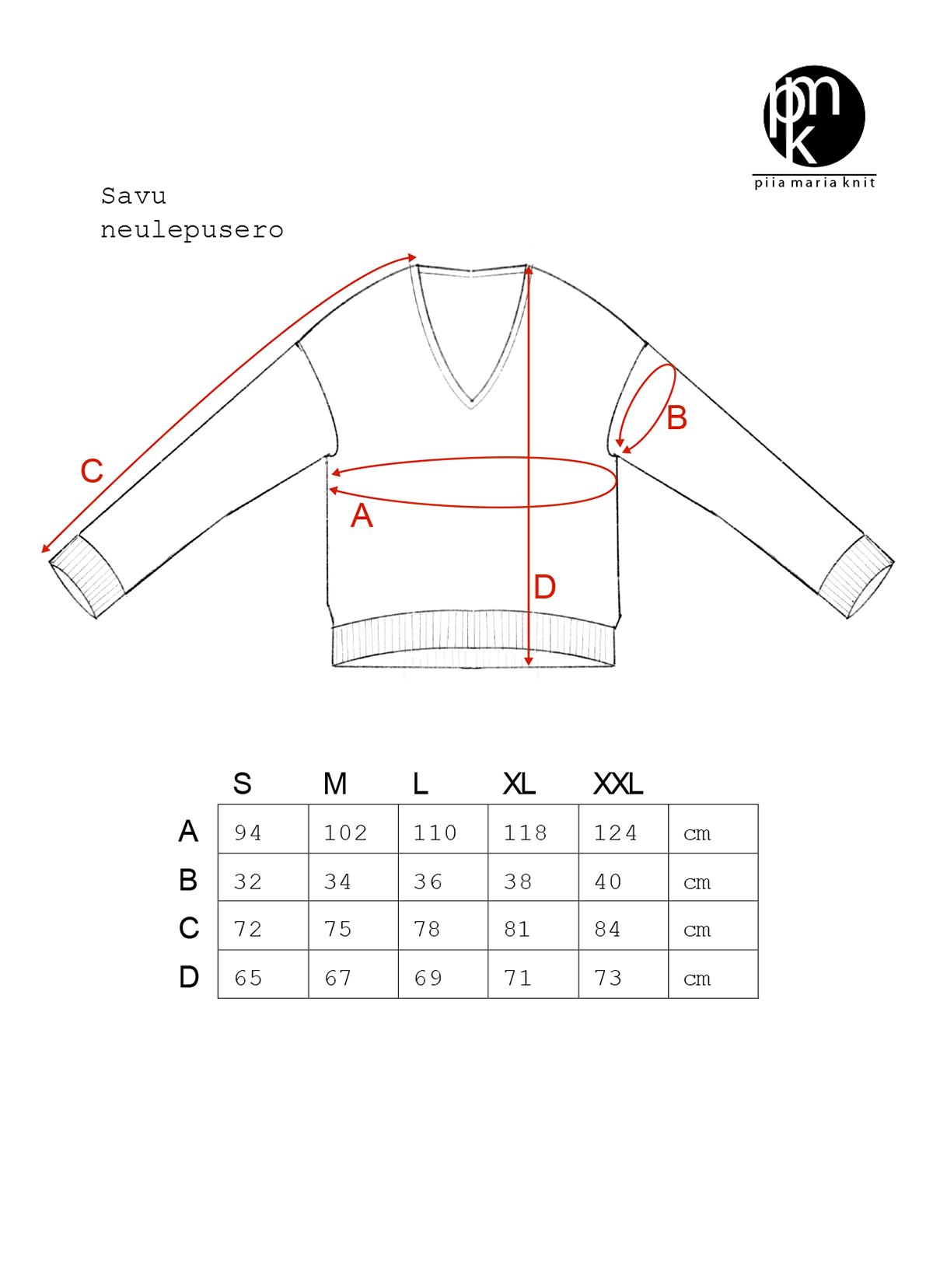 Savun neulotaan pörröisestÀ PMK alpakka/puuvillasta. Valitse neljĂ€stĂ€ vĂ€ristĂ€ mieluisin ja tarkista mittataulukosta oikea koko. Suositeltu vĂ€ljyysvara on 10-14 cm.Â